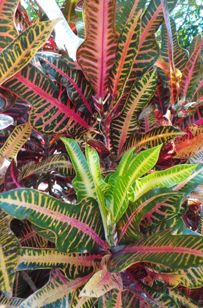 The foliage color ranges from green variegated with white, pink, orange, red, yellow, or purple in various combinations that may change as the leaves age. Markings may follow along the major veins or may be blotches on any part of the leaf blade in regular or random patterns. Sports, or shoots that are completely different in appearance from the parent plant, are not uncommon. As with most plants in the Euphorbiaceae, the milky sap that bleeds from cut stems may cause contact dermatitis in susceptible individuals.