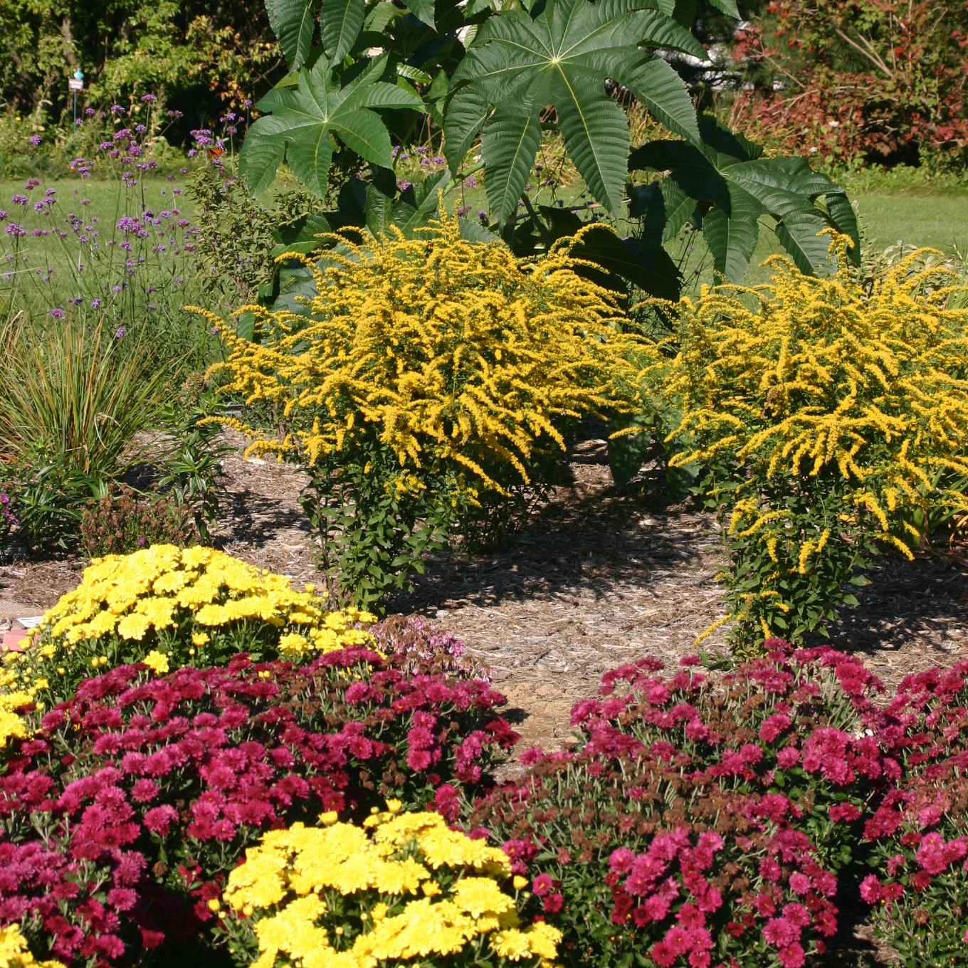 Other plants that ‘Fireworks’ goldenrod contrasts well with include Sedum ‘Autumn Joy’, Boltonia (also commonly called false aster), joe-pye weed (Eupatorium), cardinal flower (Lobelia cardinalis), great blue lobelia (L. siphilitica), and ironweed (Vernonia). Also consider ornamental grasses such as feather reed grass (Calamagrostis x acutiflora), little bluestem (Schizachyrium scoparium), switch grass (Panicum virgatum), prairie dropseed (Sporobolus heterolepis), and other late-blooming prairie plants. For a nice color echo, try Swamp or Narrow-leaved Sunflower (Helianthus angustifolius), a tall (to 6 feet) species that produces yellow flowers in late summer and early autumn.