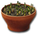 Plant bulbs from September through November for indoor bloom. Use plastic or preferably clay containers with drainage holes. Proper drainage is crucial for forcing bulbs. Use a potting mix that is equal parts soil, sharp builder’s sand, and peat moss. Partially fill containers with potting mix, arrange bulbs so that their necks will be at or just below the surface, and gently add more potting mix around the bulbs. Amaryllis bulbs can be planted with the top 1/3 of the bulb above the level of the potting mix. Smaller bulbs like grape hyacinth and crocus may be covered by one half to one inch of the potting mix.