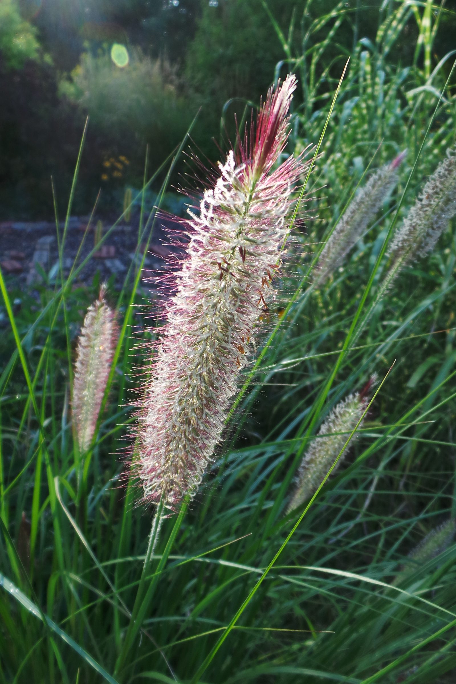 In late summer showy, white to pink, copper or purple flower spikes are produced above the leaves. The flowers are concentrated in the narrow bottle-brush form on the end of the spike and seeds are hidden within the bristles of the fuzzy-looking inflorescences. Fountain grass flower spikes are particularly dramatic when backlit, so try to position the plants to take advantage of the sun behind them. The plants may not bloom when the growing season is very short. The inflorescences do not last the entire winter, only holding together for a few months as the seeds begin to shatter after a few hard freezes.