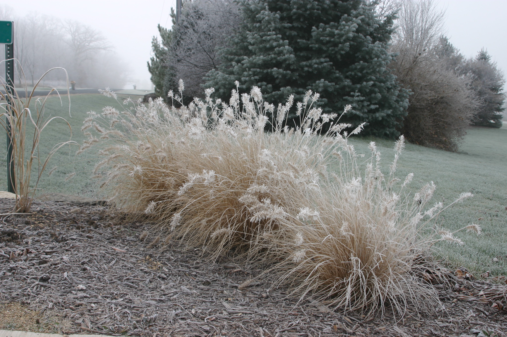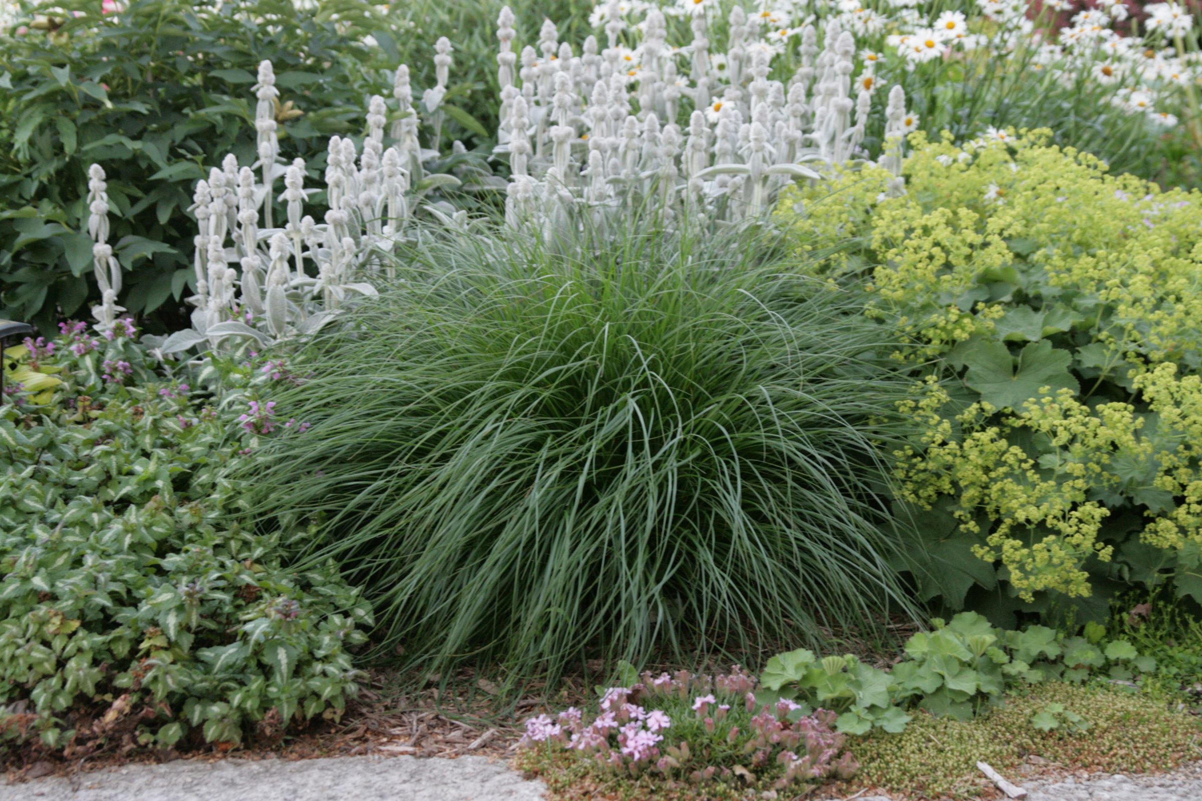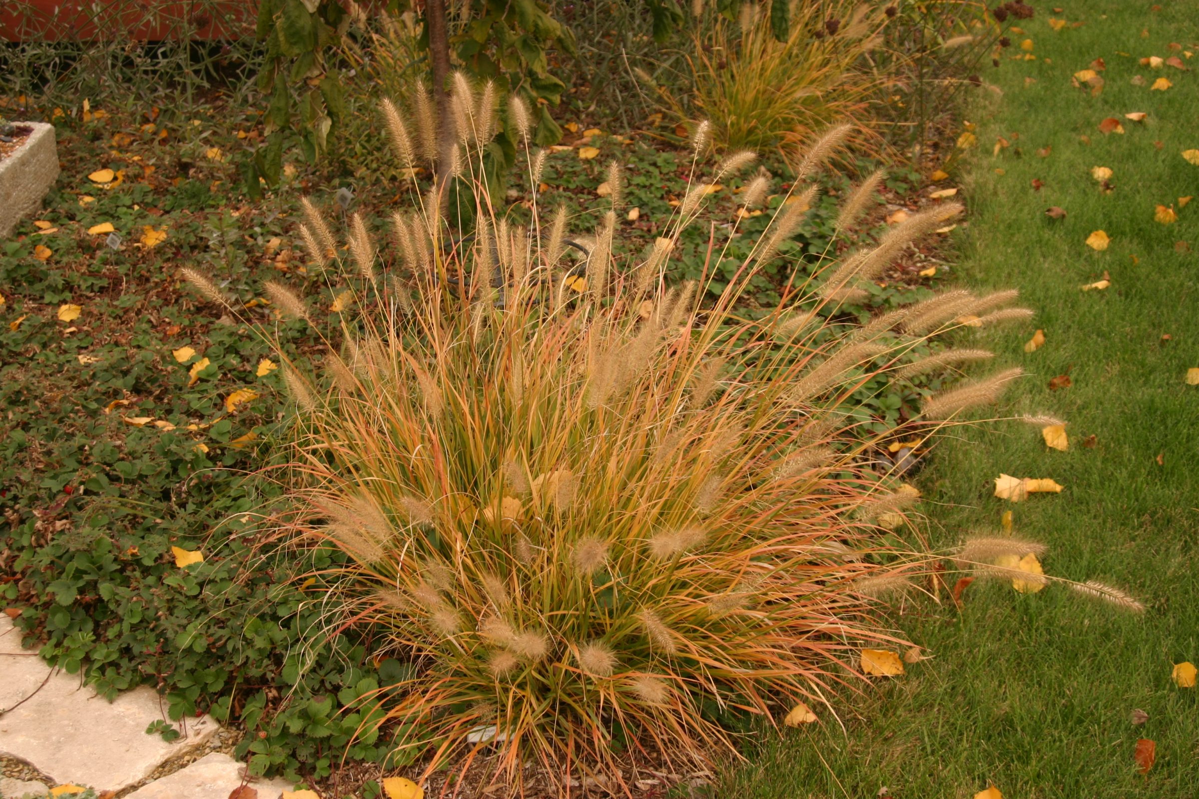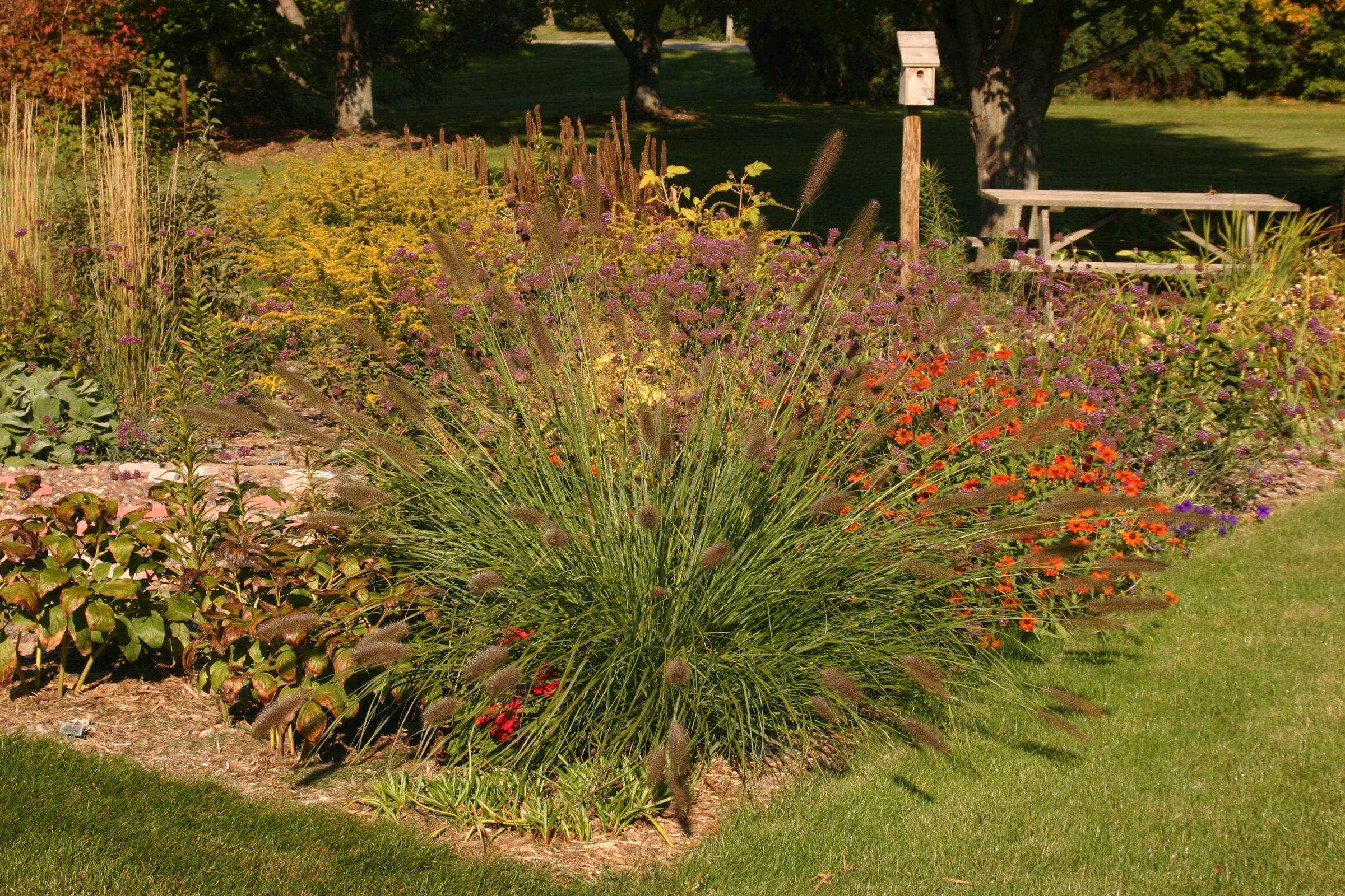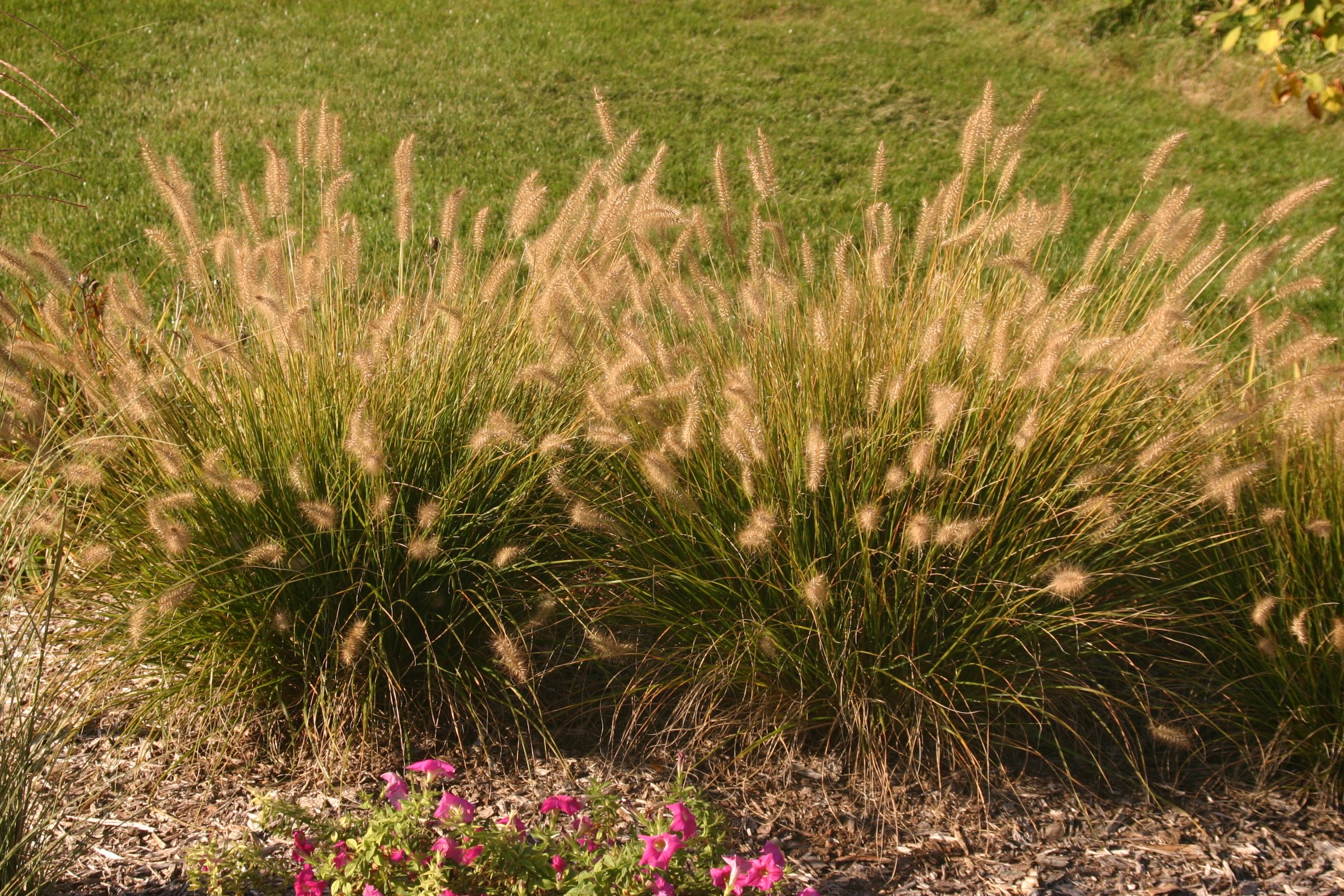 Use fountain grass as a specimen plant or focal point in smaller areas. In large gardens use plants individually or in small groups with perennials and shrubs to provide a contrast of texture or massed in large groups as a tall ground cover. Fountain grass is better suited for residential landscapes than many other ornamental grasses because of its moderate size, and works well in rock gardens, fronts of borders, and around water gardens, streams or ponds. It has a particularly beautiful effect when reflected in water. Some people feel it looks weedy early in the season before the inflorescences appear but others like its soft, fine texture and movement in the breeze at all stages of growth. Fountain grass makes a good informal edging along hardscapes or to soften the edges of paths. Try planting near lady’s mantle (Alchemilla mollis) or purple cultivars of Heuchera for dramatic contrast. It provides a good foil for variegated plants, such as low-growing Lamium maculatum ‘Anne Greenaway’ or ‘Pink Nancy’ or a taller shrub like ‘Carol Mackie’ Daphne.
