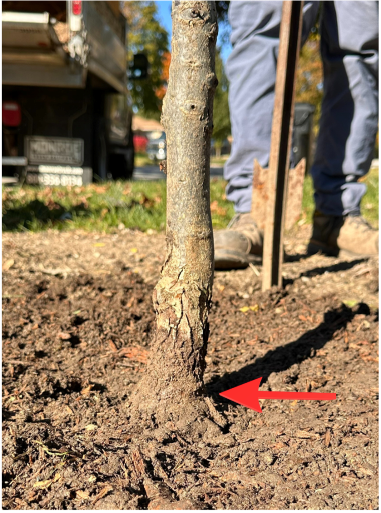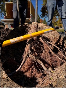 - a) Position the tree where the beginning of its root collar remains visible above the planting hole. To check the planting depth, lay a shovel across the hole to observe where the root collar meets and adjust the planting depth.