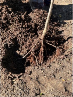 Bareroot trees are less bulky to transport, handle and plant in ground. They hold more root mass than balled and burlapped (B&B) trees, are comparatively inexpensive and can be planted correctly at proper depth (Picture 1). Another advantage of planting bareroot trees is the ability to visually inspect and correct any deformed roots before planting. Young trees with a caliper size of 1.5” to 1.75” are ideal for bareroot transplanting as they provide quick establishment.