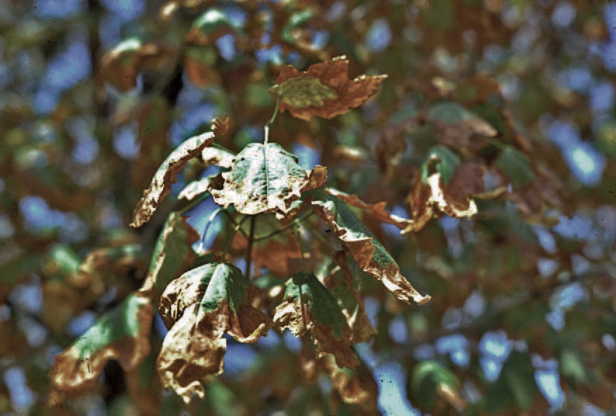 Foliar chloride concentrations that exceed 0.5% dry weight for conifers and 1.0% for deciduous plants are considered harmful. Use clean pruners and wear gloves when handling the samples to avoid contamination of sample, or prune the tissue directly into plastic bags. Contact Extension for specific instructions, location, and costs for this service.