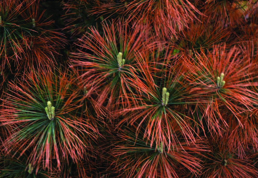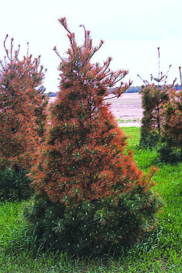 - Tips of mature needles turn brown or yellow; discoloration moves down the needle, eventually killing entire needle; damaged needles eventually fall off